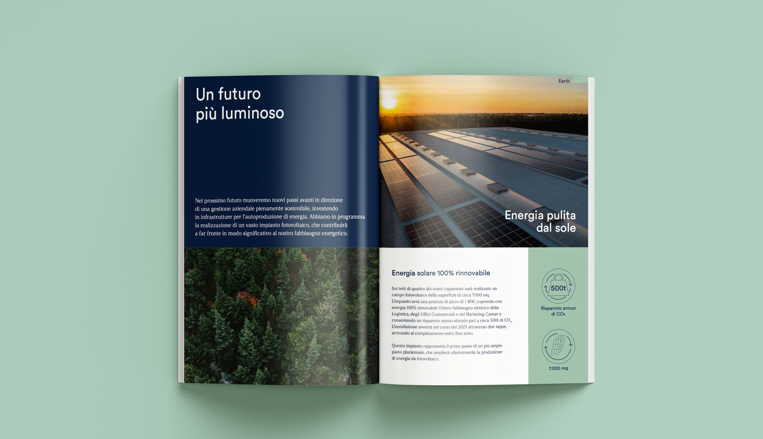 We created a storytelling and visual format, treating the ESG policy as a brand communication project. We thus brought out the continuity of Caesar’s commitment, showing the milestone achieved as the sum of many stages of the corporate journey.